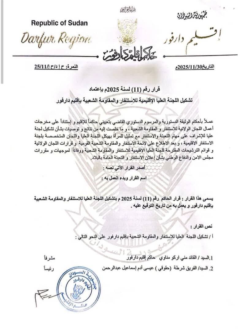 وأوضح مناوي في القرار أن اللجنة العليا للاستنفار والمقاومة الشعبية بإقليم دارفور يشرف عليها حاكم الإقليم ويرأسها الفريق شرطة عيسى آدم إسماعيل عبد الرحمن.