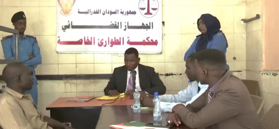 ويظهر في الفيديو عدد من الأشخاص يرتدون الزي المدني وزي الشرطة داخل قاعة المحكمة، خلف القاضي لافتة تحمل شعار “جمهورية السودان الفيدرالية – الجهاز القضائي”.