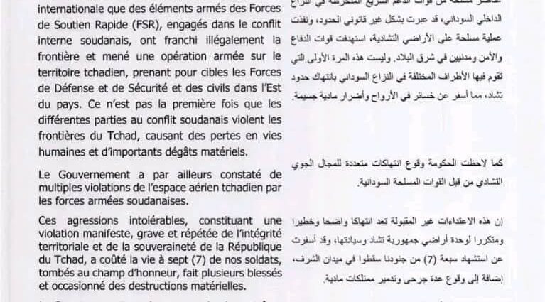 The Chadian government announced Thursday that seven soldiers from its defense and security forces were killed in an armed clash with elements of Sudan’s Rapid Support Forces (RSF) after they crossed into Chadian territory from Sudan.